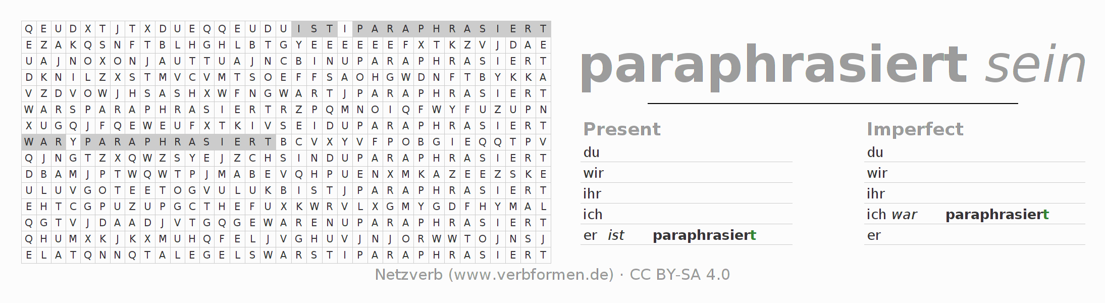 With these search word puzzles you can learn the conjugation of the German verb paraphrasieren.