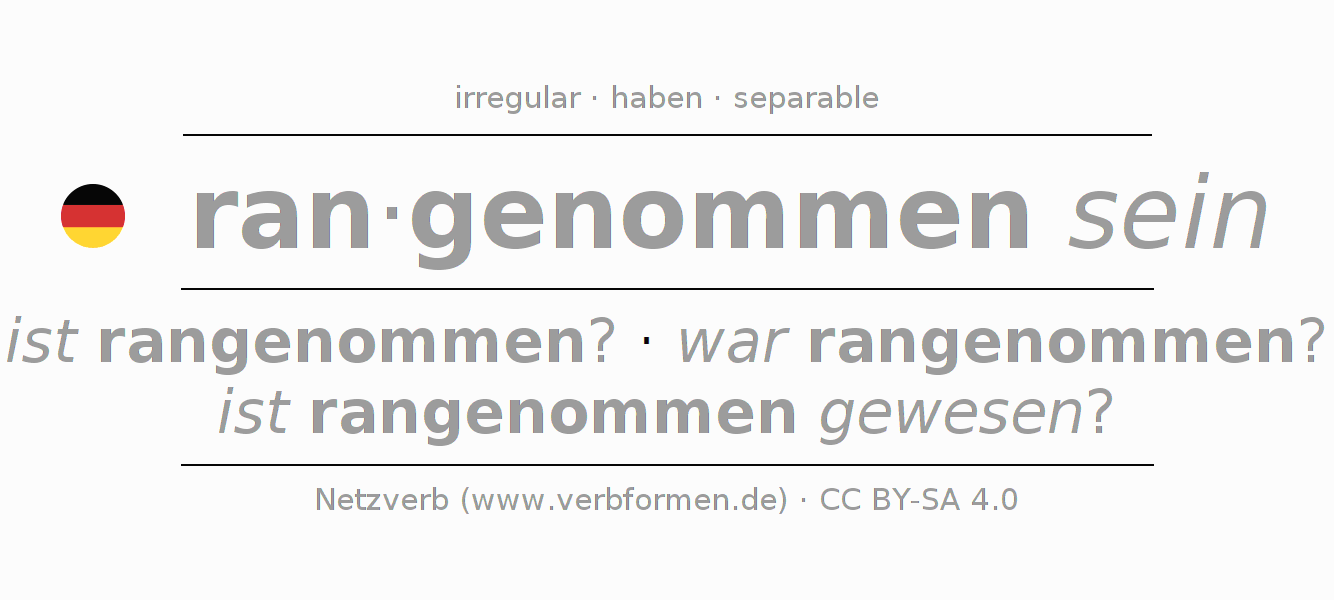 Worksheets are used generally for the conjugation of the verb rannehmen in teaching. The materials can be used as Open Educational Resources (OER) for exercises, for games and as Tasks (CC BY-SA 4.0). There are many different types of tasks available for the verb rannehmen. These are overview sheets with complete conjugation, puzzles and games that require joint learning. The entire educational material is available for free as a PDF download, as pictures and as an interactive browser version. In addition to the tasks, countless examples for rannehmen also provide an aid to using the verb.