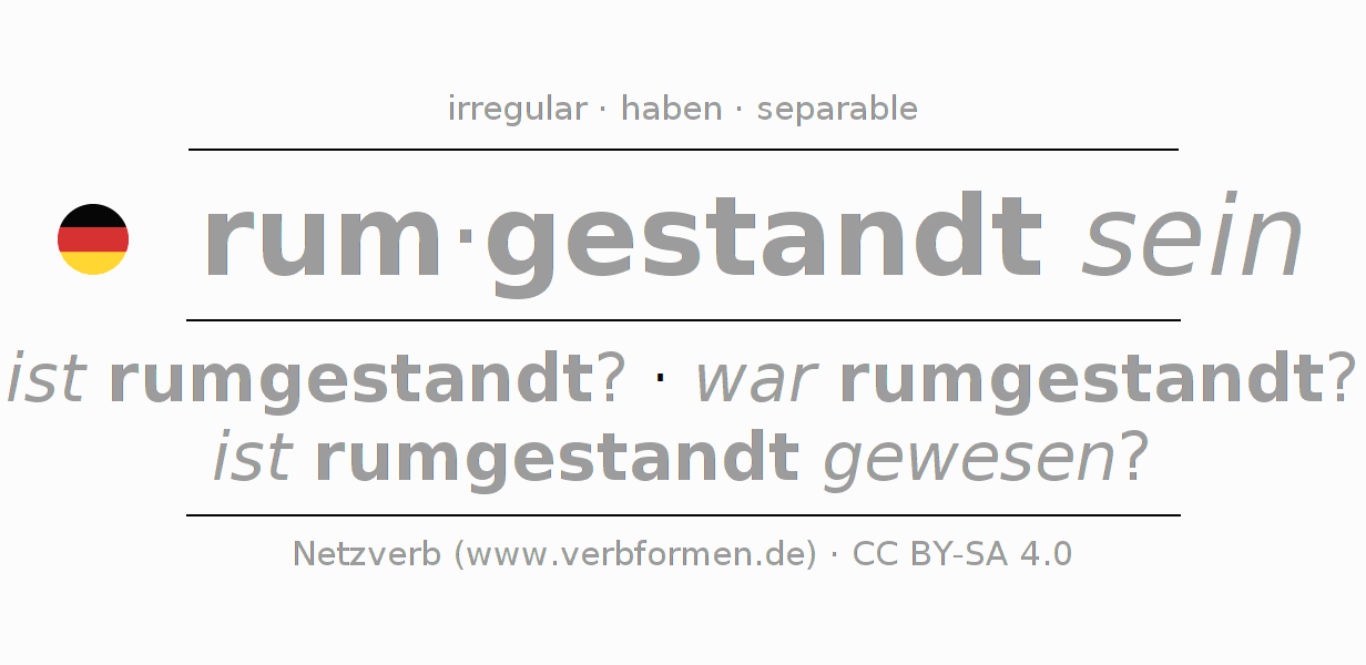 Worksheets are used generally for the conjugation of the verb rumstehen in teaching. The materials can be used as Open Educational Resources (OER) for exercises, for games and as Tasks (CC BY-SA 4.0). There are many different types of tasks available for the verb rumstehen. These are overview sheets with complete conjugation, puzzles and games that require joint learning. The entire educational material is available for free as a PDF download, as pictures and as an interactive browser version. In addition to the tasks, countless examples for rumstehen also provide an aid to using the verb.