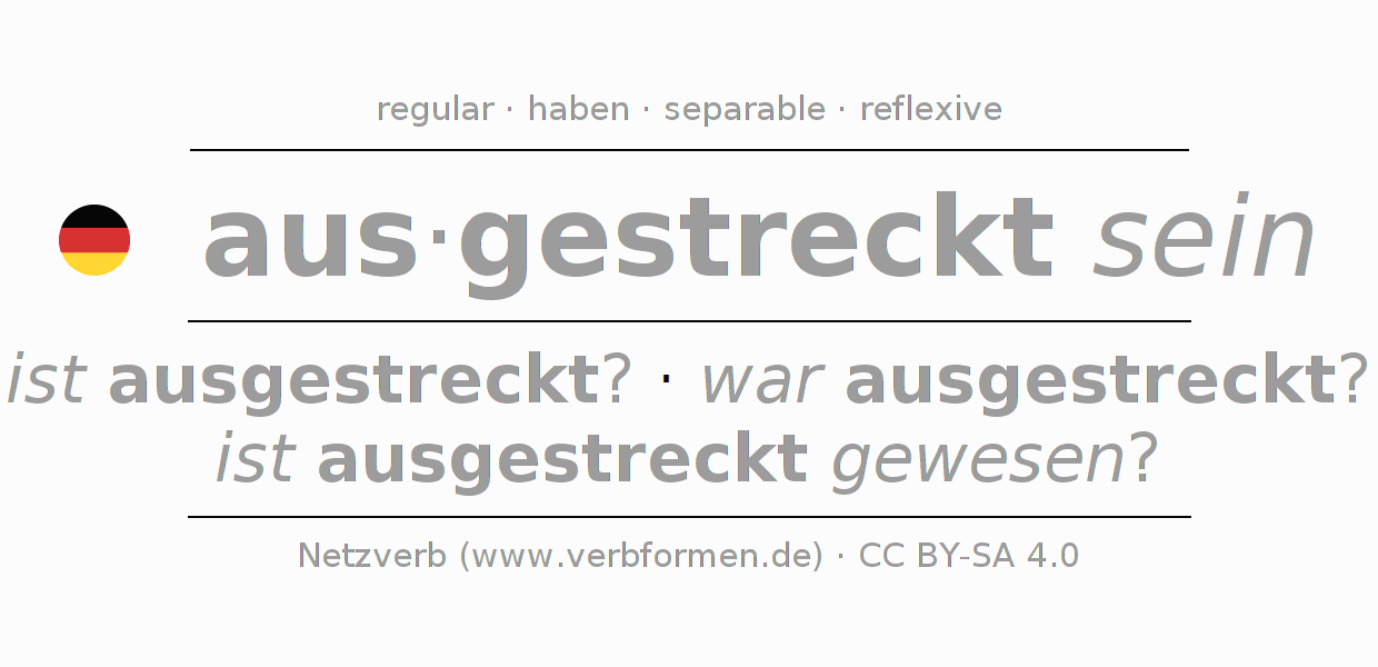 Worksheets are used generally for the conjugation of the verb ausstrecken in teaching. The materials can be used as Open Educational Resources (OER) for exercises, for games and as Tasks (CC BY-SA 4.0). There are many different types of tasks available for the verb sich ausstrecken. These are overview sheets with complete conjugation, puzzles and games that require joint learning. The entire educational material is available for free as a PDF download, as pictures and as an interactive browser version. In addition to the tasks, countless examples for ausstrecken also provide an aid to using the verb.