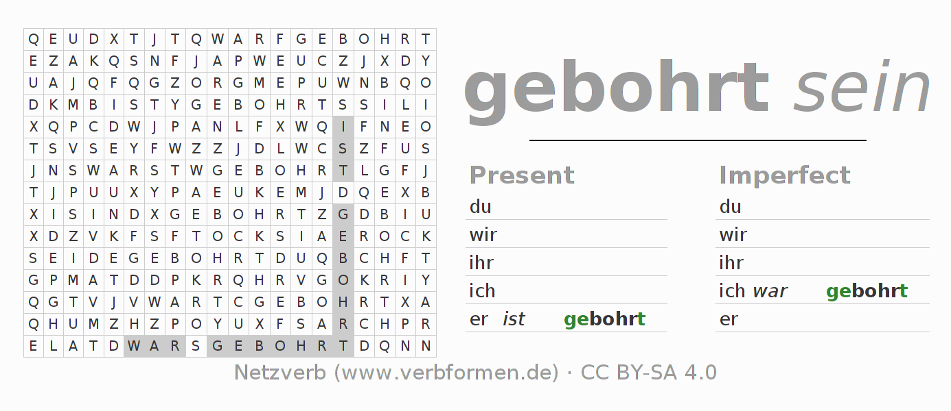 Worksheets are used generally for the conjugation of the verb bohren in teaching. The materials can be used as Open Educational Resources (OER) for exercises, for games and as Tasks (CC BY-SA 4.0). There are many different types of tasks available for the verb sich bohren. These are overview sheets with complete conjugation, puzzles and games that require joint learning. The entire educational material is available for free as a PDF download, as pictures and as an interactive browser version. In addition to the tasks, countless examples for bohren also provide an aid to using the verb.