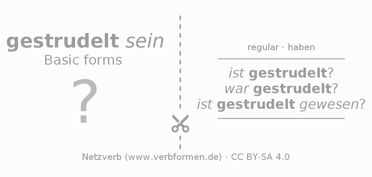 Worksheets are used generally for the conjugation of the verb strudeln in teaching. The materials can be used as Open Educational Resources (OER) for exercises, for games and as Tasks (CC BY-SA 4.0). There are many different types of tasks available for the verb strudeln. These are overview sheets with complete conjugation, puzzles and games that require joint learning. The entire educational material is available for free as a PDF download, as pictures and as an interactive browser version. In addition to the tasks, countless examples for strudeln also provide an aid to using the verb.