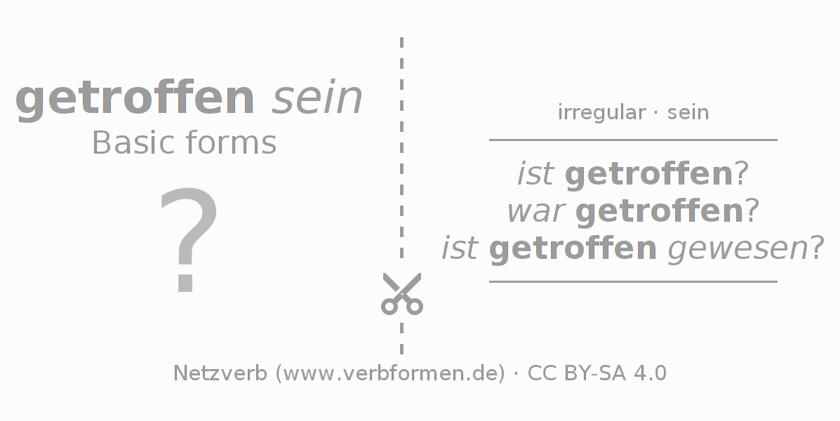 Worksheets are used generally for the conjugation of the verb treffen in teaching. The materials can be used as Open Educational Resources (OER) for exercises, for games and as Tasks (CC BY-SA 4.0). There are many different types of tasks available for the verb treffen (ist). These are overview sheets with complete conjugation, puzzles and games that require joint learning. The entire educational material is available for free as a PDF download, as pictures and as an interactive browser version. In addition to the tasks, countless examples for treffen also provide an aid to using the verb.