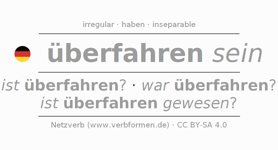 Worksheets are used generally for the conjugation of the verb überfahren in teaching. The materials can be used as Open Educational Resources (OER) for exercises, for games and as Tasks (CC BY-SA 4.0). There are many different types of tasks available for the verb überfahren (hat). These are overview sheets with complete conjugation, puzzles and games that require joint learning. The entire educational material is available for free as a PDF download, as pictures and as an interactive browser version. In addition to the tasks, countless examples for überfahren also provide an aid to using the verb.