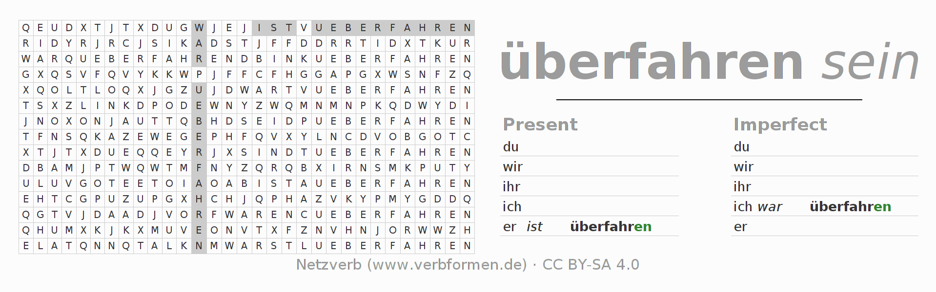 With these search word puzzles you can learn the conjugation of the German verb überfahren.