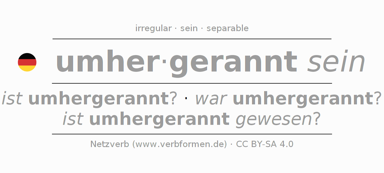 Worksheets are used generally for the conjugation of the verb umherrennen in teaching. The materials can be used as Open Educational Resources (OER) for exercises, for games and as Tasks (CC BY-SA 4.0). There are many different types of tasks available for the verb umherrennen. These are overview sheets with complete conjugation, puzzles and games that require joint learning. The entire educational material is available for free as a PDF download, as pictures and as an interactive browser version. In addition to the tasks, countless examples for umherrennen also provide an aid to using the verb.