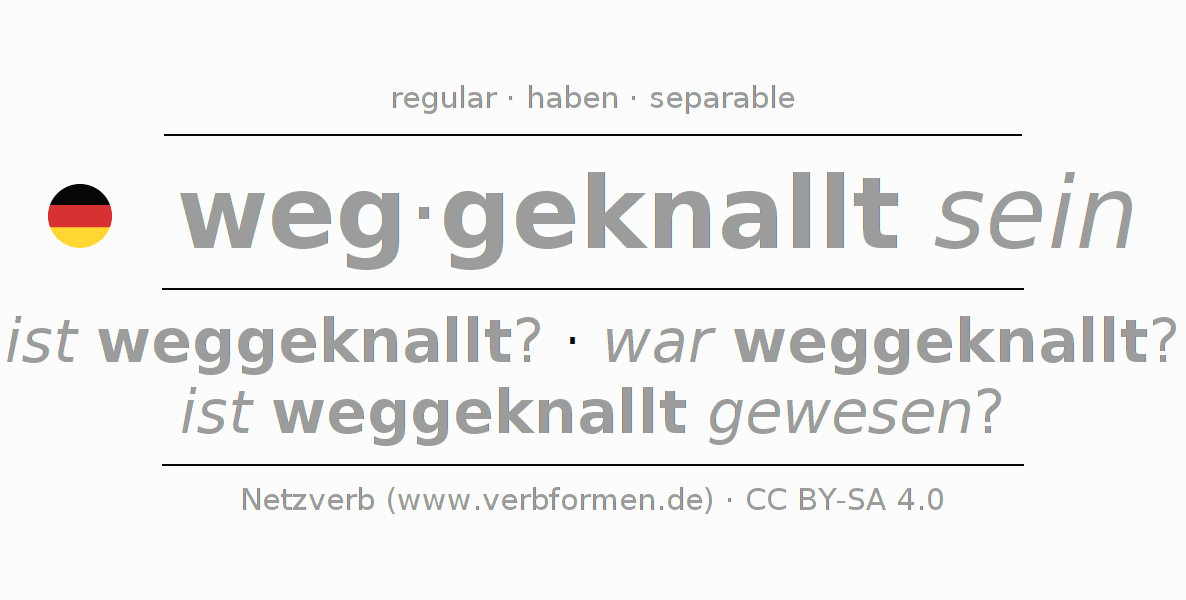 Worksheets are used generally for the conjugation of the verb wegknallen in teaching. The materials can be used as Open Educational Resources (OER) for exercises, for games and as Tasks (CC BY-SA 4.0). There are many different types of tasks available for the verb wegknallen. These are overview sheets with complete conjugation, puzzles and games that require joint learning. The entire educational material is available for free as a PDF download, as pictures and as an interactive browser version. In addition to the tasks, countless examples for wegknallen also provide an aid to using the verb.