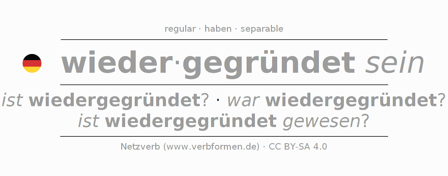 Worksheets are used generally for the conjugation of the verb wiedergründen in teaching. The materials can be used as Open Educational Resources (OER) for exercises, for games and as Tasks (CC BY-SA 4.0). There are many different types of tasks available for the verb wiedergründen. These are overview sheets with complete conjugation, puzzles and games that require joint learning. The entire educational material is available for free as a PDF download, as pictures and as an interactive browser version. In addition to the tasks, countless examples for wiedergründen also provide an aid to using the verb.
