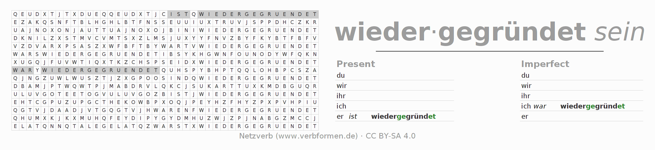 With these search word puzzles you can learn the conjugation of the German verb wiedergründen.
