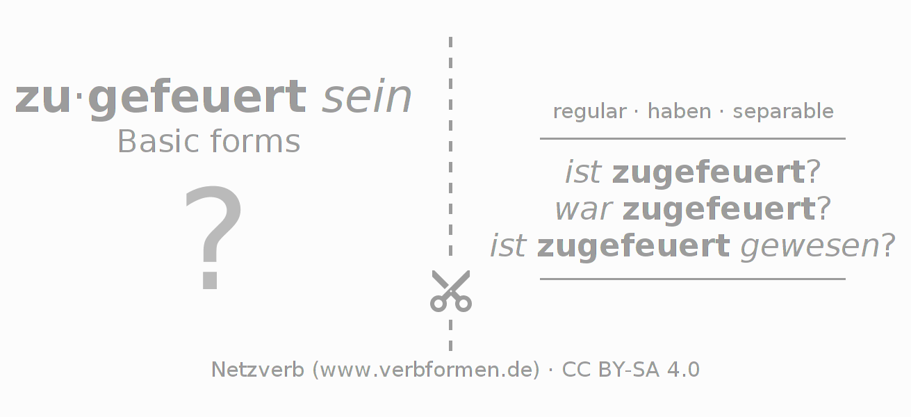 Worksheets are used generally for the conjugation of the verb zufeuern in teaching. The materials can be used as Open Educational Resources (OER) for exercises, for games and as Tasks (CC BY-SA 4.0). There are many different types of tasks available for the verb zufeuern. These are overview sheets with complete conjugation, puzzles and games that require joint learning. The entire educational material is available for free as a PDF download, as pictures and as an interactive browser version. In addition to the tasks, countless examples for zufeuern also provide an aid to using the verb.