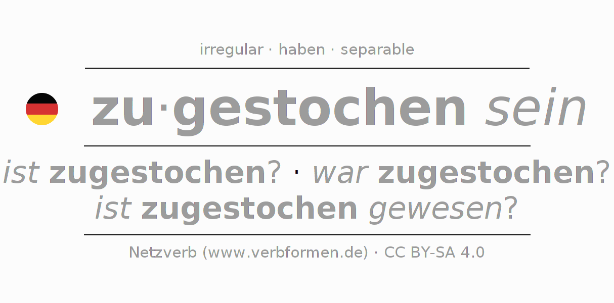 Worksheets are used generally for the conjugation of the verb zustechen in teaching. The materials can be used as Open Educational Resources (OER) for exercises, for games and as Tasks (CC BY-SA 4.0). There are many different types of tasks available for the verb zustechen. These are overview sheets with complete conjugation, puzzles and games that require joint learning. The entire educational material is available for free as a PDF download, as pictures and as an interactive browser version. In addition to the tasks, countless examples for zustechen also provide an aid to using the verb.