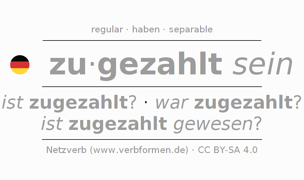 Worksheets are used generally for the conjugation of the verb zuzahlen in teaching. The materials can be used as Open Educational Resources (OER) for exercises, for games and as Tasks (CC BY-SA 4.0). There are many different types of tasks available for the verb zuzahlen. These are overview sheets with complete conjugation, puzzles and games that require joint learning. The entire educational material is available for free as a PDF download, as pictures and as an interactive browser version. In addition to the tasks, countless examples for zuzahlen also provide an aid to using the verb.