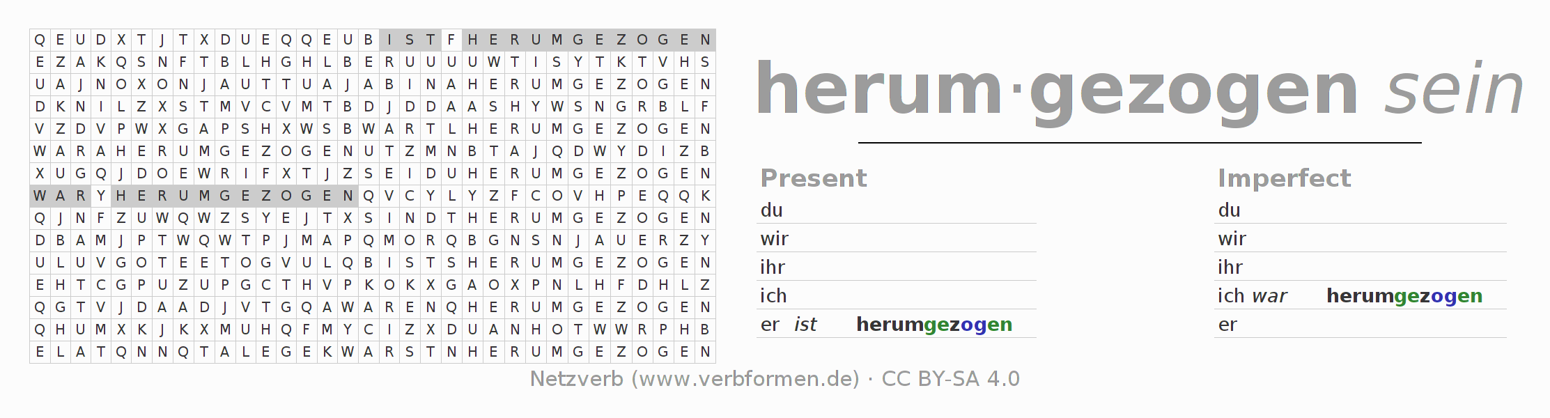 With these search word puzzles you can learn the conjugation of the German verb herumziehen.