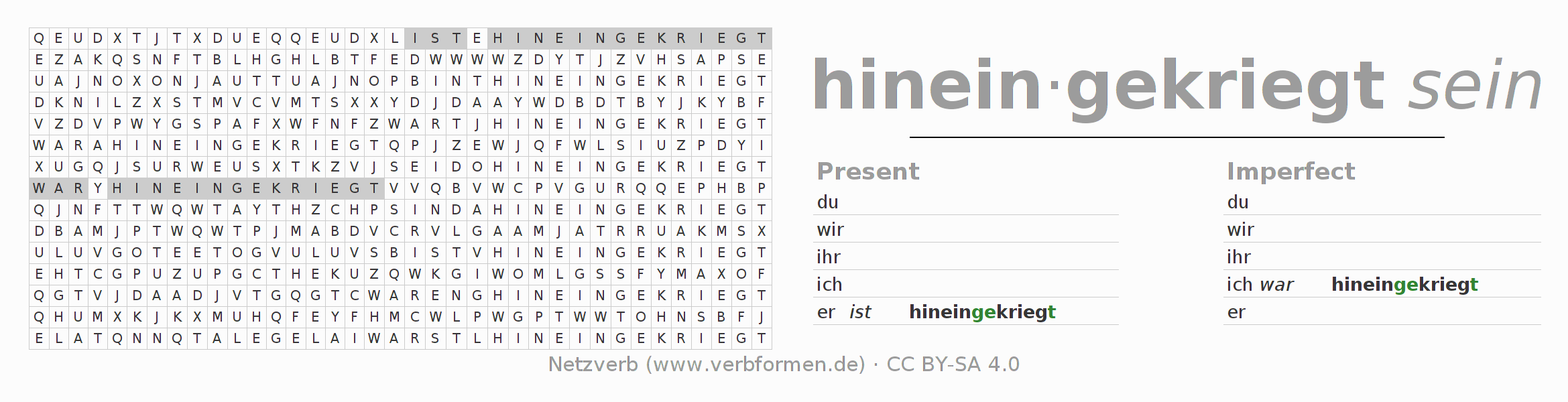 With these search word puzzles you can learn the conjugation of the German verb hineinkriegen.