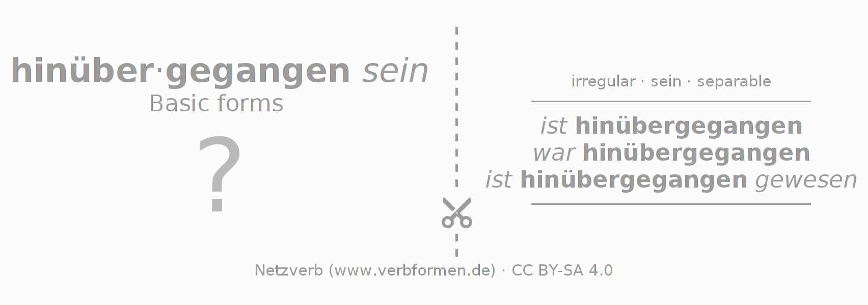 Worksheets are used generally for the conjugation of the verb hinübergehen in teaching. The materials can be used as Open Educational Resources (OER) for exercises, for games and as Tasks (CC BY-SA 4.0). There are many different types of tasks available for the verb hinübergehen. These are overview sheets with complete conjugation, puzzles and games that require joint learning. The entire educational material is available for free as a PDF download, as pictures and as an interactive browser version. In addition to the tasks, countless examples for hinübergehen also provide an aid to using the verb.