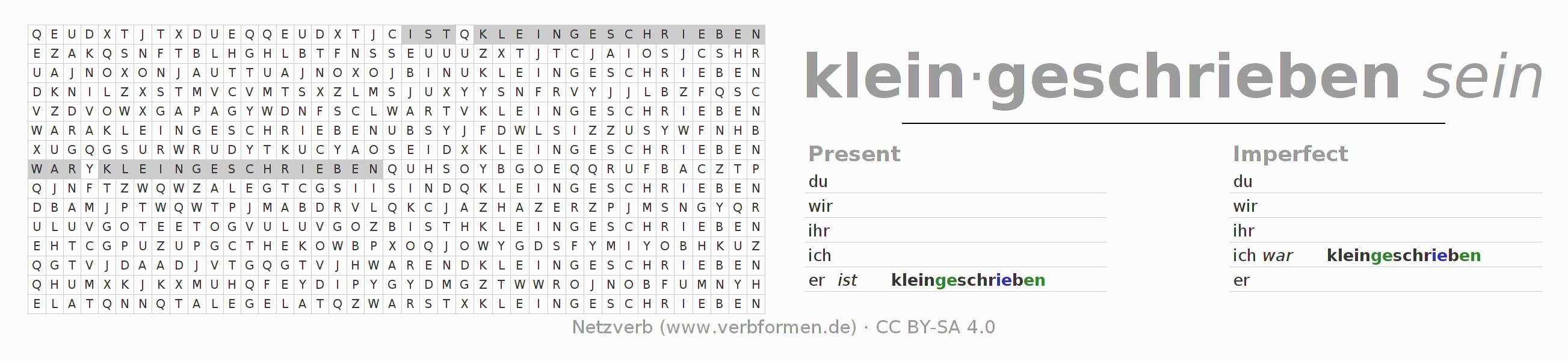 Worksheets are used generally for the conjugation of the verb kleinschreiben in teaching. The materials can be used as Open Educational Resources (OER) for exercises, for games and as Tasks (CC BY-SA 4.0). There are many different types of tasks available for the verb kleinschreiben. These are overview sheets with complete conjugation, puzzles and games that require joint learning. The entire educational material is available for free as a PDF download, as pictures and as an interactive browser version. In addition to the tasks, countless examples for kleinschreiben also provide an aid to using the verb.