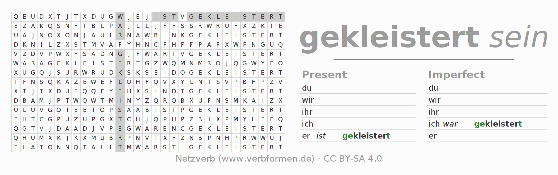 Worksheets are used generally for the conjugation of the verb kleistern in teaching. The materials can be used as Open Educational Resources (OER) for exercises, for games and as Tasks (CC BY-SA 4.0). There are many different types of tasks available for the verb kleistern. These are overview sheets with complete conjugation, puzzles and games that require joint learning. The entire educational material is available for free as a PDF download, as pictures and as an interactive browser version. In addition to the tasks, countless examples for kleistern also provide an aid to using the verb.