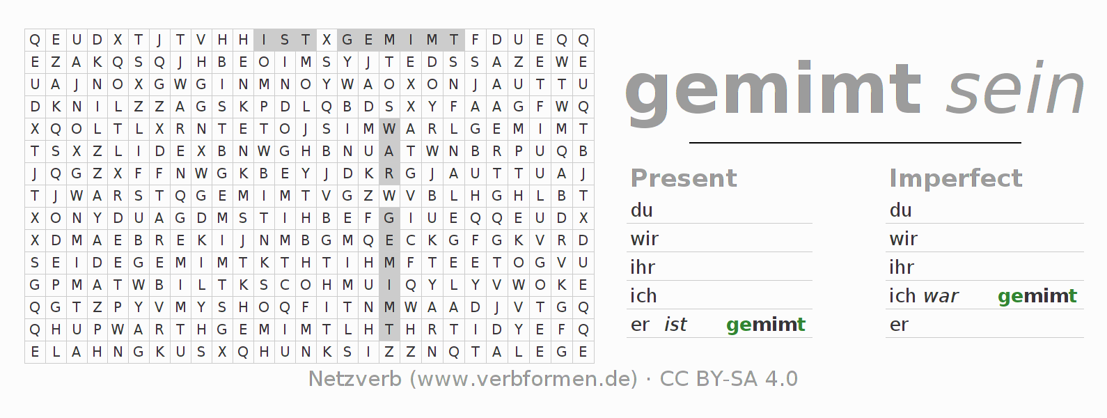 With these search word puzzles you can learn the conjugation of the German verb mimen.