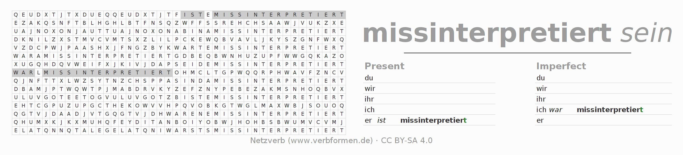 With these search word puzzles you can learn the conjugation of the German verb missinterpretieren.
