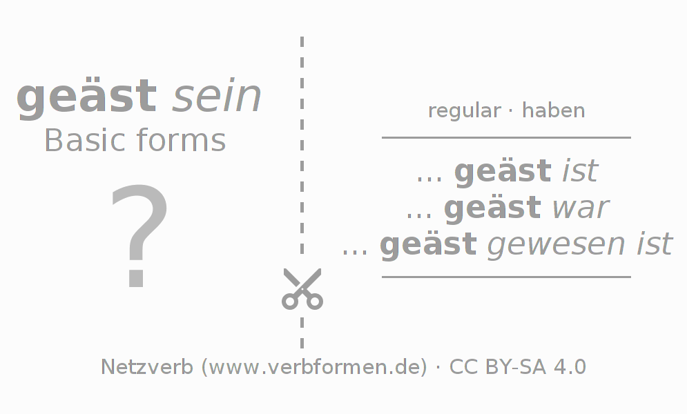 Worksheets are used generally for the conjugation of the verb äsen in teaching. The materials can be used as Open Educational Resources (OER) for exercises, for games and as Tasks (CC BY-SA 4.0). There are many different types of tasks available for the verb äsen. These are overview sheets with complete conjugation, puzzles and games that require joint learning. The entire educational material is available for free as a PDF download, as pictures and as an interactive browser version. In addition to the tasks, countless examples for äsen also provide an aid to using the verb.