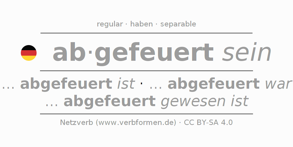 Worksheets are used generally for the conjugation of the verb abfeuern in teaching. The materials can be used as Open Educational Resources (OER) for exercises, for games and as Tasks (CC BY-SA 4.0). There are many different types of tasks available for the verb abfeuern. These are overview sheets with complete conjugation, puzzles and games that require joint learning. The entire educational material is available for free as a PDF download, as pictures and as an interactive browser version. In addition to the tasks, countless examples for abfeuern also provide an aid to using the verb.