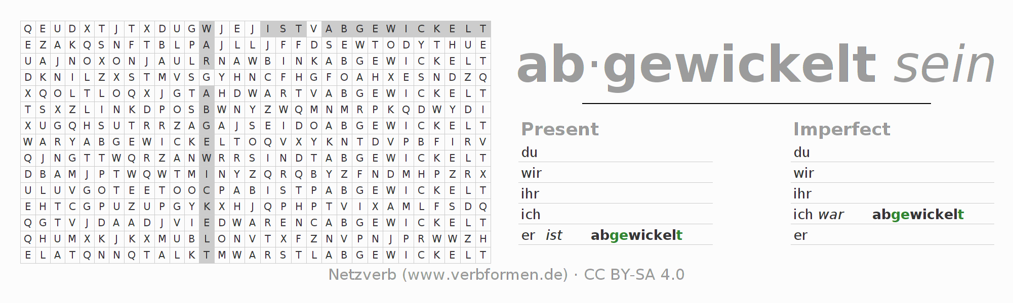 With these search word puzzles you can learn the conjugation of the German verb abwickeln.