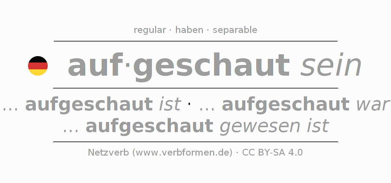 Worksheets are used generally for the conjugation of the verb aufschauen in teaching. The materials can be used as Open Educational Resources (OER) for exercises, for games and as Tasks (CC BY-SA 4.0). There are many different types of tasks available for the verb aufschauen. These are overview sheets with complete conjugation, puzzles and games that require joint learning. The entire educational material is available for free as a PDF download, as pictures and as an interactive browser version. In addition to the tasks, countless examples for aufschauen also provide an aid to using the verb.