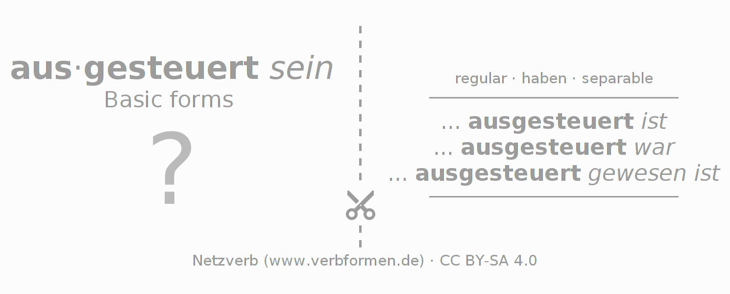 Worksheets are used generally for the conjugation of the verb aussteuern in teaching. The materials can be used as Open Educational Resources (OER) for exercises, for games and as Tasks (CC BY-SA 4.0). There are many different types of tasks available for the verb aussteuern. These are overview sheets with complete conjugation, puzzles and games that require joint learning. The entire educational material is available for free as a PDF download, as pictures and as an interactive browser version. In addition to the tasks, countless examples for aussteuern also provide an aid to using the verb.