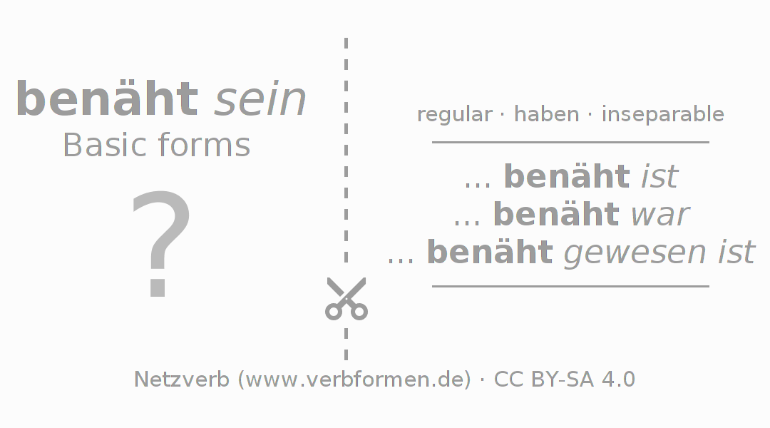 Worksheets are used generally for the conjugation of the verb benähen in teaching. The materials can be used as Open Educational Resources (OER) for exercises, for games and as Tasks (CC BY-SA 4.0). There are many different types of tasks available for the verb benähen. These are overview sheets with complete conjugation, puzzles and games that require joint learning. The entire educational material is available for free as a PDF download, as pictures and as an interactive browser version. In addition to the tasks, countless examples for benähen also provide an aid to using the verb.