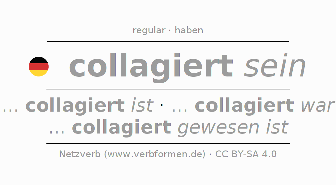 Worksheets are used generally for the conjugation of the verb collagieren in teaching. The materials can be used as Open Educational Resources (OER) for exercises, for games and as Tasks (CC BY-SA 4.0). There are many different types of tasks available for the verb collagieren. These are overview sheets with complete conjugation, puzzles and games that require joint learning. The entire educational material is available for free as a PDF download, as pictures and as an interactive browser version. In addition to the tasks, countless examples for collagieren also provide an aid to using the verb.