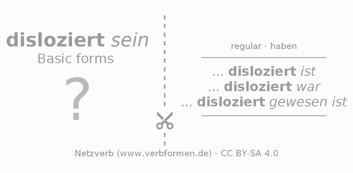 Worksheets are used generally for the conjugation of the verb dislozieren in teaching. The materials can be used as Open Educational Resources (OER) for exercises, for games and as Tasks (CC BY-SA 4.0). There are many different types of tasks available for the verb dislozieren. These are overview sheets with complete conjugation, puzzles and games that require joint learning. The entire educational material is available for free as a PDF download, as pictures and as an interactive browser version. In addition to the tasks, countless examples for dislozieren also provide an aid to using the verb.