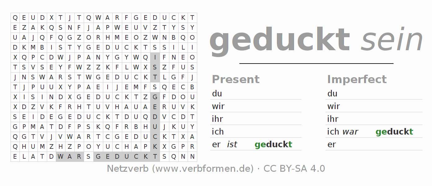 With these search word puzzles you can learn the conjugation of the German verb ducken.