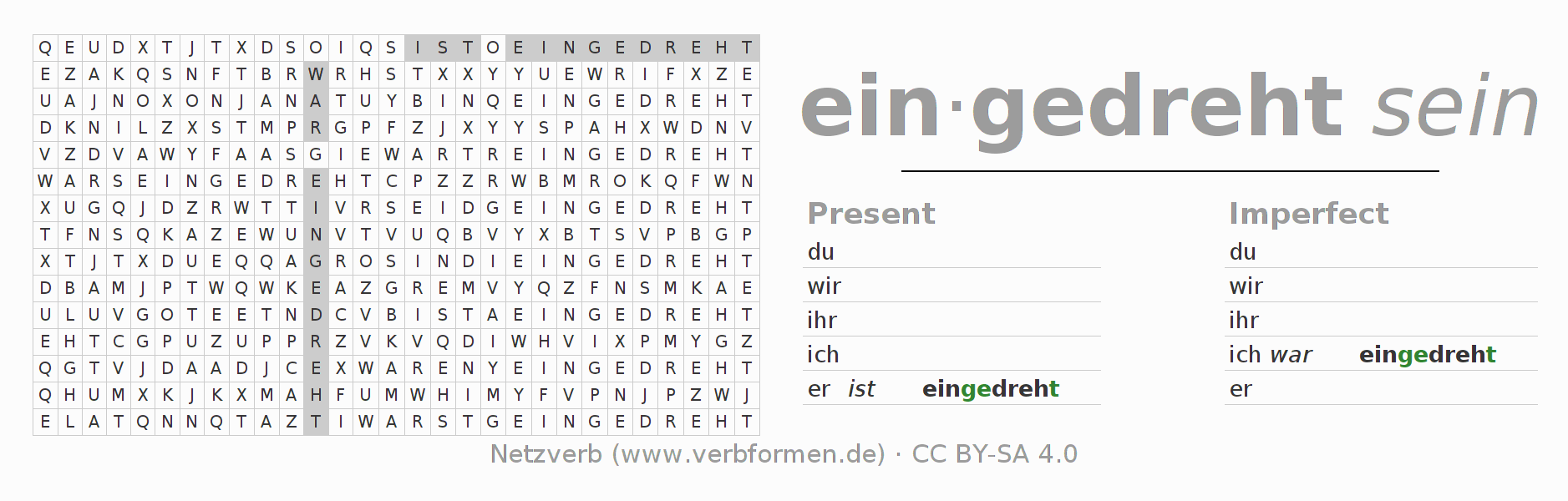 With these search word puzzles you can learn the conjugation of the German verb eindrehen.