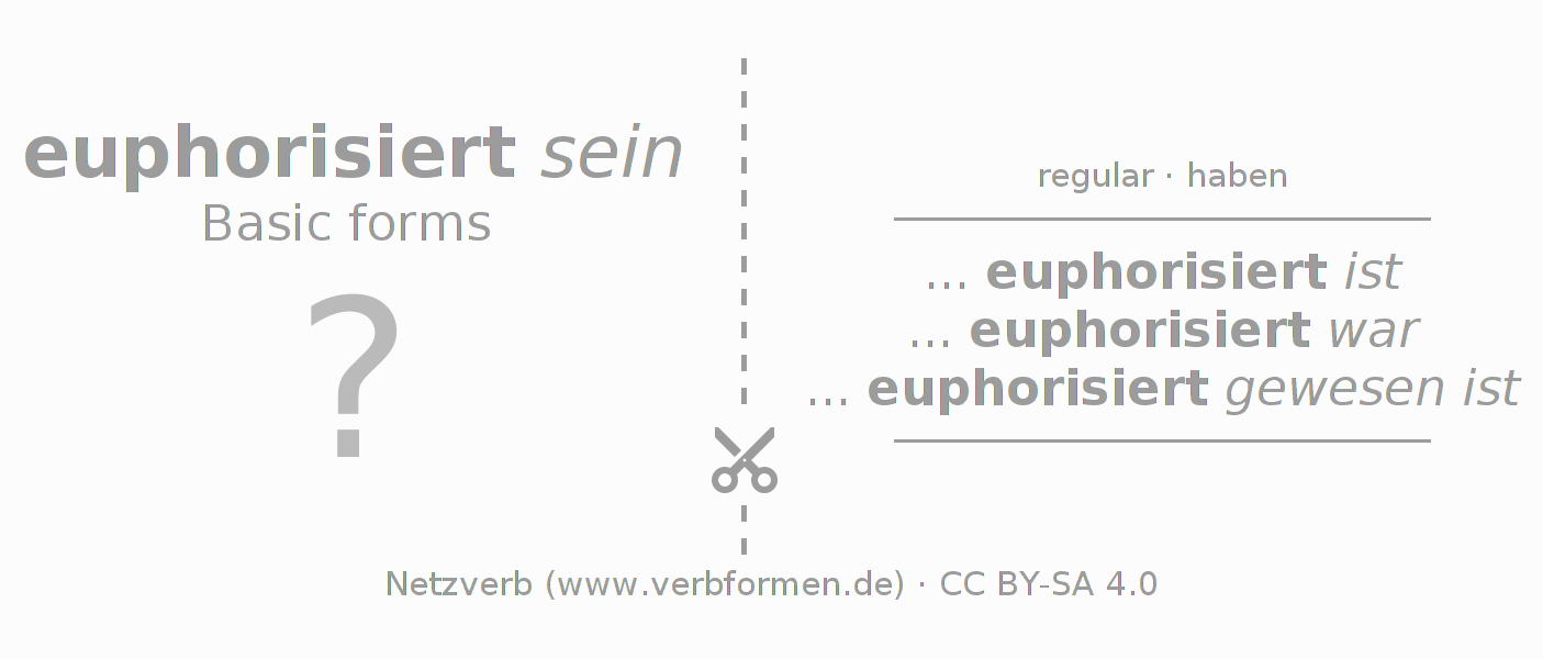 Worksheets are used generally for the conjugation of the verb euphorisieren in teaching. The materials can be used as Open Educational Resources (OER) for exercises, for games and as Tasks (CC BY-SA 4.0). There are many different types of tasks available for the verb euphorisieren. These are overview sheets with complete conjugation, puzzles and games that require joint learning. The entire educational material is available for free as a PDF download, as pictures and as an interactive browser version. In addition to the tasks, countless examples for euphorisieren also provide an aid to using the verb.
