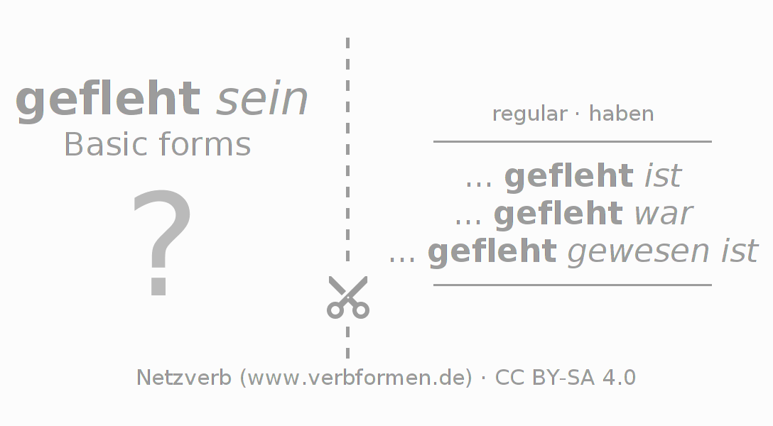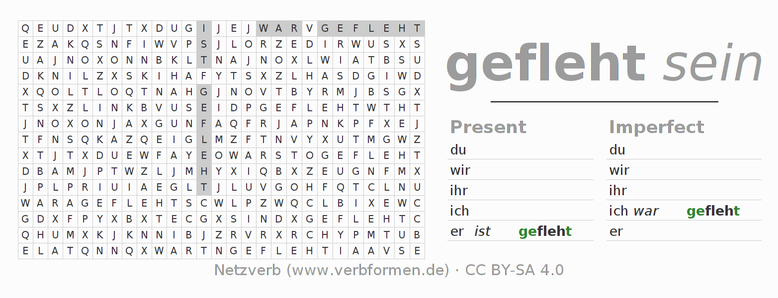 Worksheets are used generally for the conjugation of the verb flehen in teaching. The materials can be used as Open Educational Resources (OER) for exercises, for games and as Tasks (CC BY-SA 4.0). There are many different types of tasks available for the verb flehen. These are overview sheets with complete conjugation, puzzles and games that require joint learning. The entire educational material is available for free as a PDF download, as pictures and as an interactive browser version. In addition to the tasks, countless examples for flehen also provide an aid to using the verb.