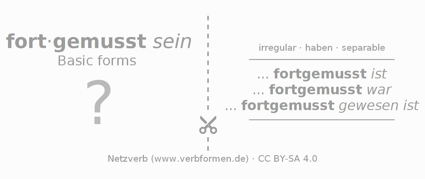 Worksheets are used generally for the conjugation of the verb fortmüssen in teaching. The materials can be used as Open Educational Resources (OER) for exercises, for games and as Tasks (CC BY-SA 4.0). There are many different types of tasks available for the verb fortmüssen. These are overview sheets with complete conjugation, puzzles and games that require joint learning. The entire educational material is available for free as a PDF download, as pictures and as an interactive browser version. In addition to the tasks, countless examples for fortmüssen also provide an aid to using the verb.
