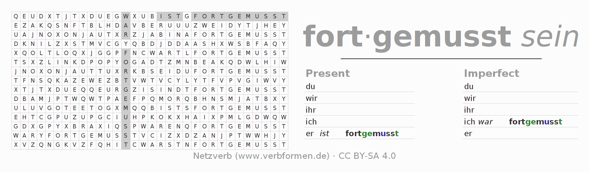 With these search word puzzles you can learn the conjugation of the German verb fortmüssen.