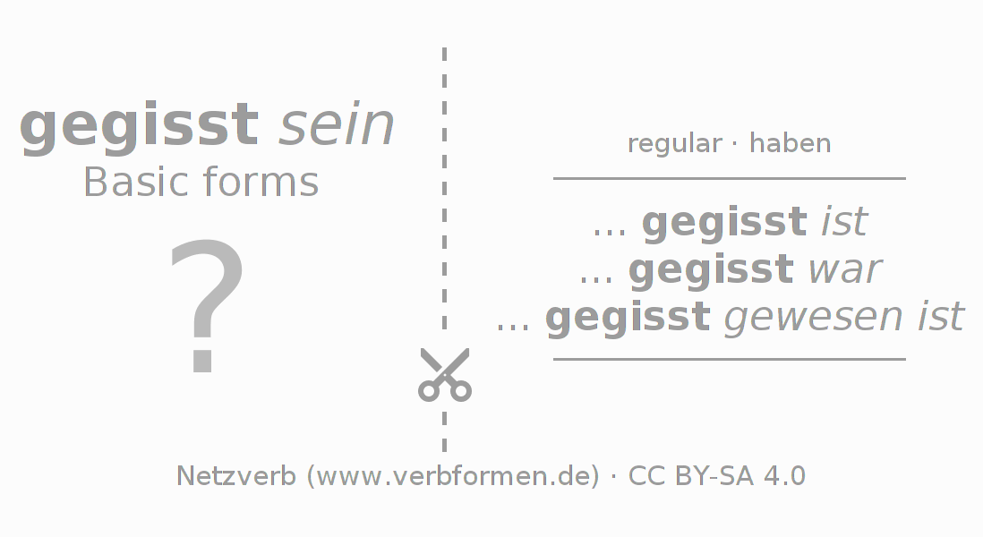Worksheets are used generally for the conjugation of the verb gissen in teaching. The materials can be used as Open Educational Resources (OER) for exercises, for games and as Tasks (CC BY-SA 4.0). There are many different types of tasks available for the verb gissen. These are overview sheets with complete conjugation, puzzles and games that require joint learning. The entire educational material is available for free as a PDF download, as pictures and as an interactive browser version. In addition to the tasks, countless examples for gissen also provide an aid to using the verb.