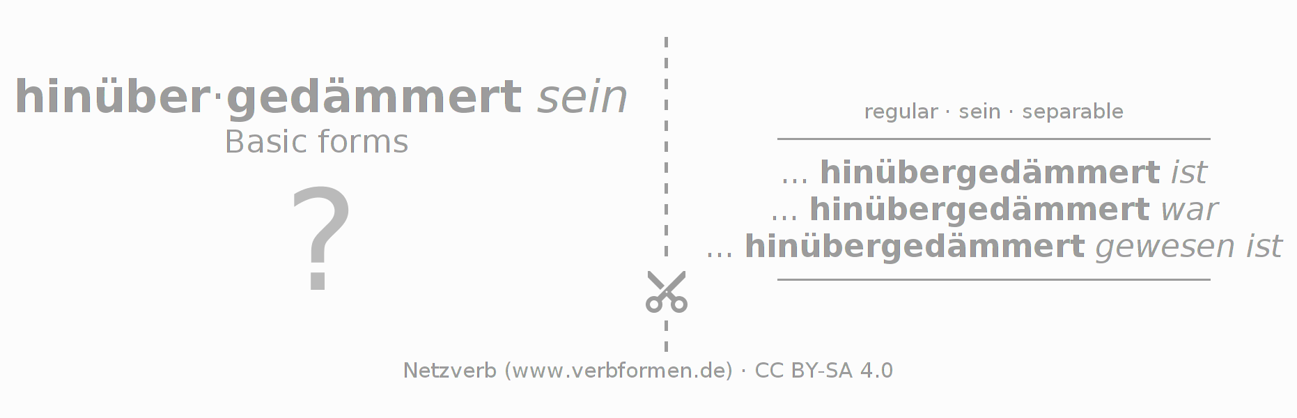 Worksheets are used generally for the conjugation of the verb hinüberdämmern in teaching. The materials can be used as Open Educational Resources (OER) for exercises, for games and as Tasks (CC BY-SA 4.0). There are many different types of tasks available for the verb hinüberdämmern. These are overview sheets with complete conjugation, puzzles and games that require joint learning. The entire educational material is available for free as a PDF download, as pictures and as an interactive browser version. In addition to the tasks, countless examples for hinüberdämmern also provide an aid to using the verb.