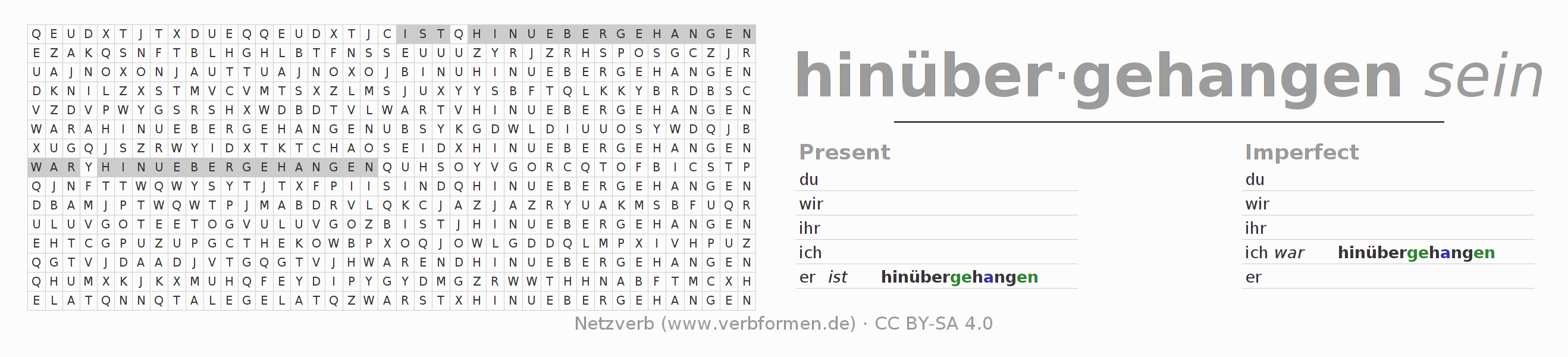With these search word puzzles you can learn the conjugation of the German verb hinüberhängen.