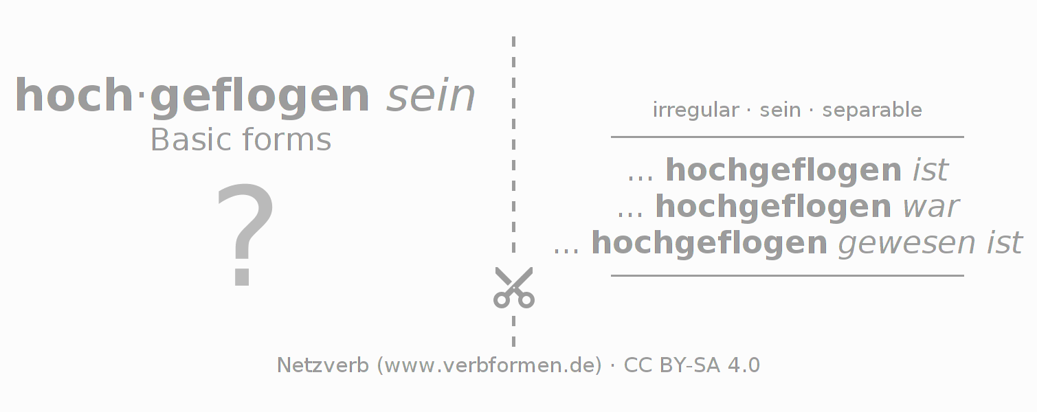 Worksheets are used generally for the conjugation of the verb hochfliegen in teaching. The materials can be used as Open Educational Resources (OER) for exercises, for games and as Tasks (CC BY-SA 4.0). There are many different types of tasks available for the verb hochfliegen. These are overview sheets with complete conjugation, puzzles and games that require joint learning. The entire educational material is available for free as a PDF download, as pictures and as an interactive browser version. In addition to the tasks, countless examples for hochfliegen also provide an aid to using the verb.