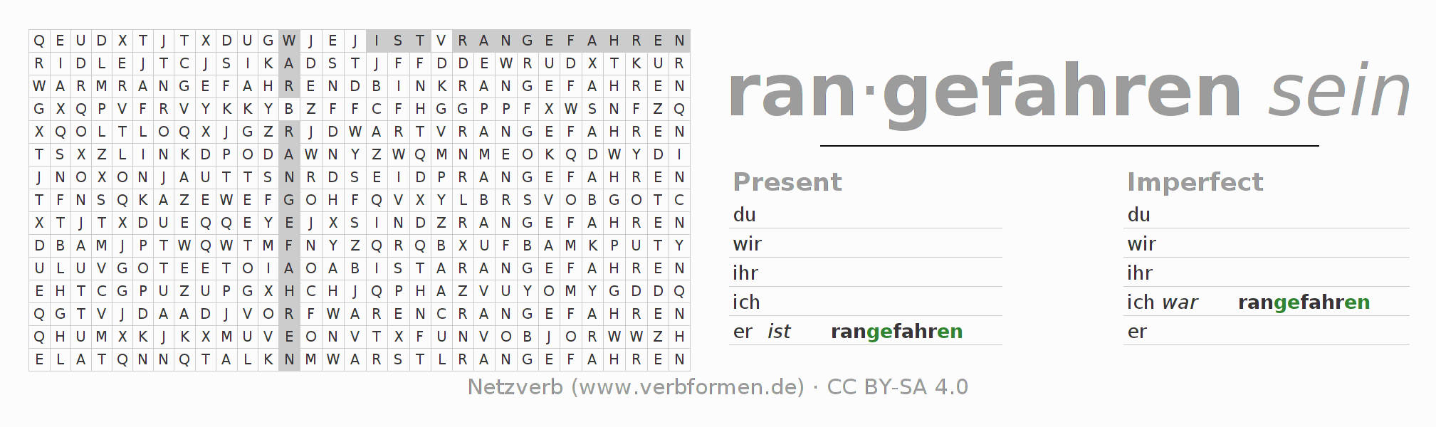 With these search word puzzles you can learn the conjugation of the German verb ranfahren.