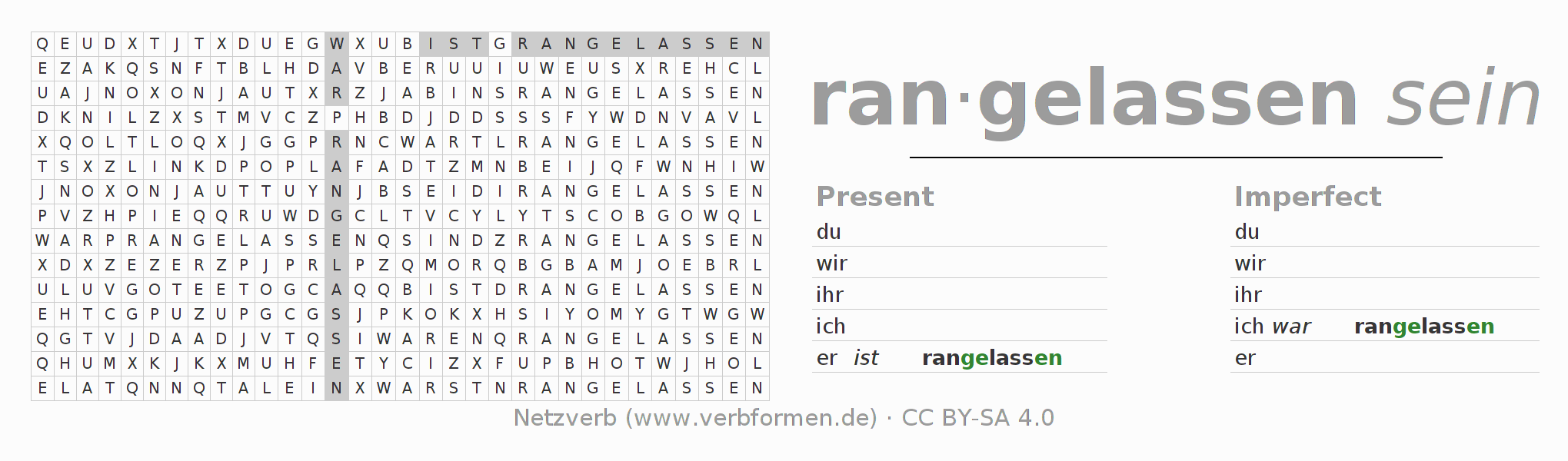 With these search word puzzles you can learn the conjugation of the German verb ranlassen.
