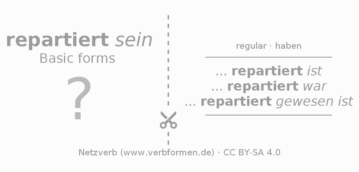 Worksheets are used generally for the conjugation of the verb repartieren in teaching. The materials can be used as Open Educational Resources (OER) for exercises, for games and as Tasks (CC BY-SA 4.0). There are many different types of tasks available for the verb repartieren. These are overview sheets with complete conjugation, puzzles and games that require joint learning. The entire educational material is available for free as a PDF download, as pictures and as an interactive browser version. In addition to the tasks, countless examples for repartieren also provide an aid to using the verb.