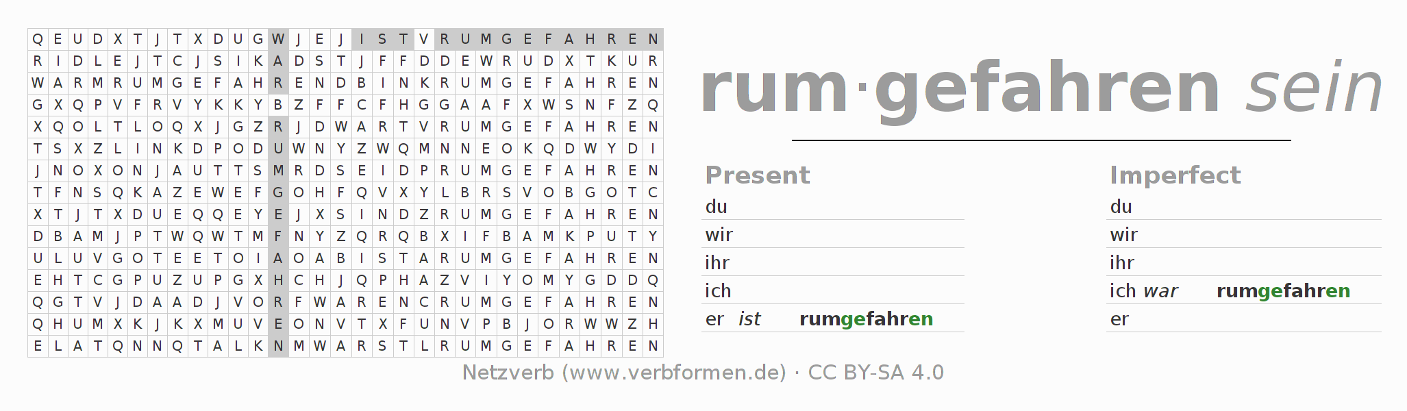 Worksheets are used generally for the conjugation of the verb rumfahren in teaching. The materials can be used as Open Educational Resources (OER) for exercises, for games and as Tasks (CC BY-SA 4.0). There are many different types of tasks available for the verb rumfahren (hat). These are overview sheets with complete conjugation, puzzles and games that require joint learning. The entire educational material is available for free as a PDF download, as pictures and as an interactive browser version. In addition to the tasks, countless examples for rumfahren also provide an aid to using the verb.