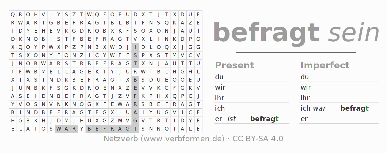 Worksheets are used generally for the conjugation of the verb befragen in teaching. The materials can be used as Open Educational Resources (OER) for exercises, for games and as Tasks (CC BY-SA 4.0). There are many different types of tasks available for the verb sich befragen (regelm). These are overview sheets with complete conjugation, puzzles and games that require joint learning. The entire educational material is available for free as a PDF download, as pictures and as an interactive browser version. In addition to the tasks, countless examples for befragen also provide an aid to using the verb.