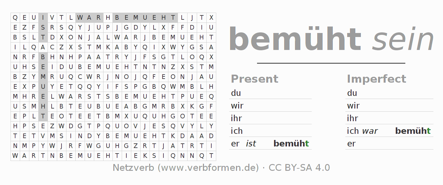 With these search word puzzles you can learn the conjugation of the German verb sich bemühen.