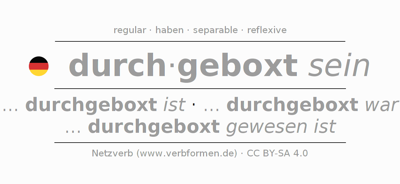Worksheets are used generally for the conjugation of the verb durchboxen in teaching. The materials can be used as Open Educational Resources (OER) for exercises, for games and as Tasks (CC BY-SA 4.0). There are many different types of tasks available for the verb sich durchboxen. These are overview sheets with complete conjugation, puzzles and games that require joint learning. The entire educational material is available for free as a PDF download, as pictures and as an interactive browser version. In addition to the tasks, countless examples for durchboxen also provide an aid to using the verb.