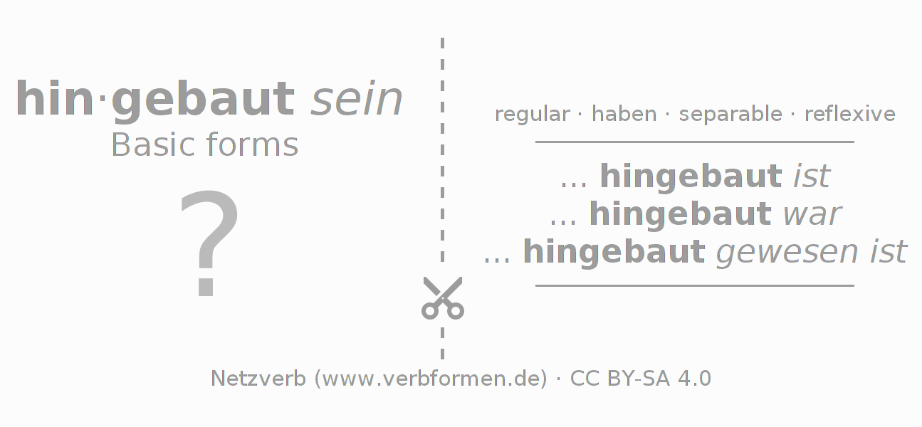 Worksheets are used generally for the conjugation of the verb hinbauen in teaching. The materials can be used as Open Educational Resources (OER) for exercises, for games and as Tasks (CC BY-SA 4.0). There are many different types of tasks available for the verb sich hinbauen. These are overview sheets with complete conjugation, puzzles and games that require joint learning. The entire educational material is available for free as a PDF download, as pictures and as an interactive browser version. In addition to the tasks, countless examples for hinbauen also provide an aid to using the verb.