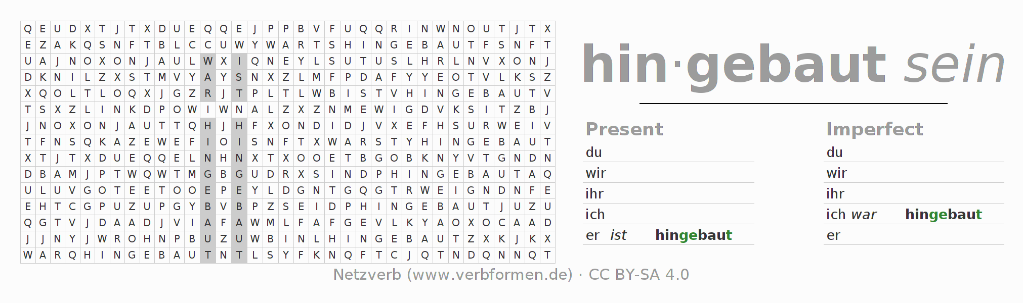 With these search word puzzles you can learn the conjugation of the German verb sich hinbauen.